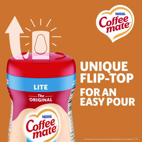 Nestle Coffee mate Powdered Coffee Creamer is an ideal way to create a delicious cup of coffee perfection. Smooth and rich, this creamer delivers classic flavor that transforms every drinking experience. Coffee mate creamer is lactose free, gluten free and non dairy. Powder makes it easy to add the right amount of flavor every time, letting you easily transform your coffee into warm deliciousness. Whether it’s your morning cup or an afternoon pick-me-up, this coffee creamer wakes up your coffee. Store Coffee mate powdered creamer in a cool, dry place. Unique Flip-Top Design–Allows for an easy pour. Flavor: Original Lite; Product Packaging: Canister; Premeasured: No; Capacity (Weight): 11 oz.